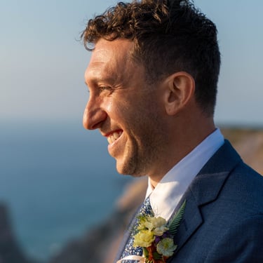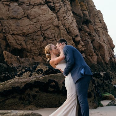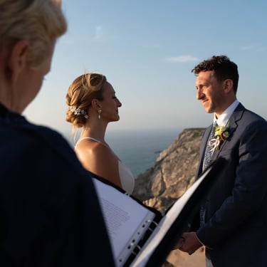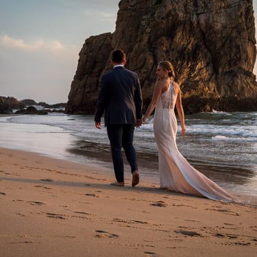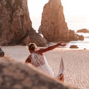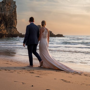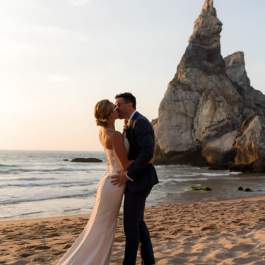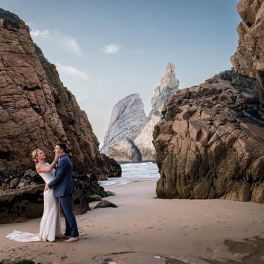 In Portugal, for a natural and authentic atmosphere in your elopement, Praia de Ursa provides an ideal setting. On this photo session, after a hike of approximately thirty minutes, a splendid backdrop unfolds, providing the perfect setting for capturing the final wedding photographs of the day. That day, as a professional photographer I took advantage of the soft light and warm tones of the golden hour, creating a warm ambiance and subtle shadows for intimate portraits.